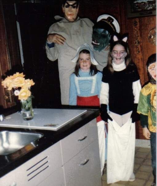 I wrote the following poem in the fall of 1989, when I was 17, a senior in Mike Rainnie’s poetry class at Falmouth High School. Although my deserted neighborhood of Falmouth Heights in the 70s and 80s was a ghost town, Halloween was still a major event in our family. My dad would escort us to the scattered homes within walking distance, then he’d chauffeur us around in “the blue car” or the wood-paneled station wagon, the evening culminating with sundaes at the home of our friends, Kevin and Mary Lane, who lived near Falmouth Harbor. Every year, we’d try to “fool them” by pretending the gaggle of children on the doorstep *wasn’t the Murphy kids, while Dad watched from the shadows, suddenly jumping out to “surprise” them. It never got old.